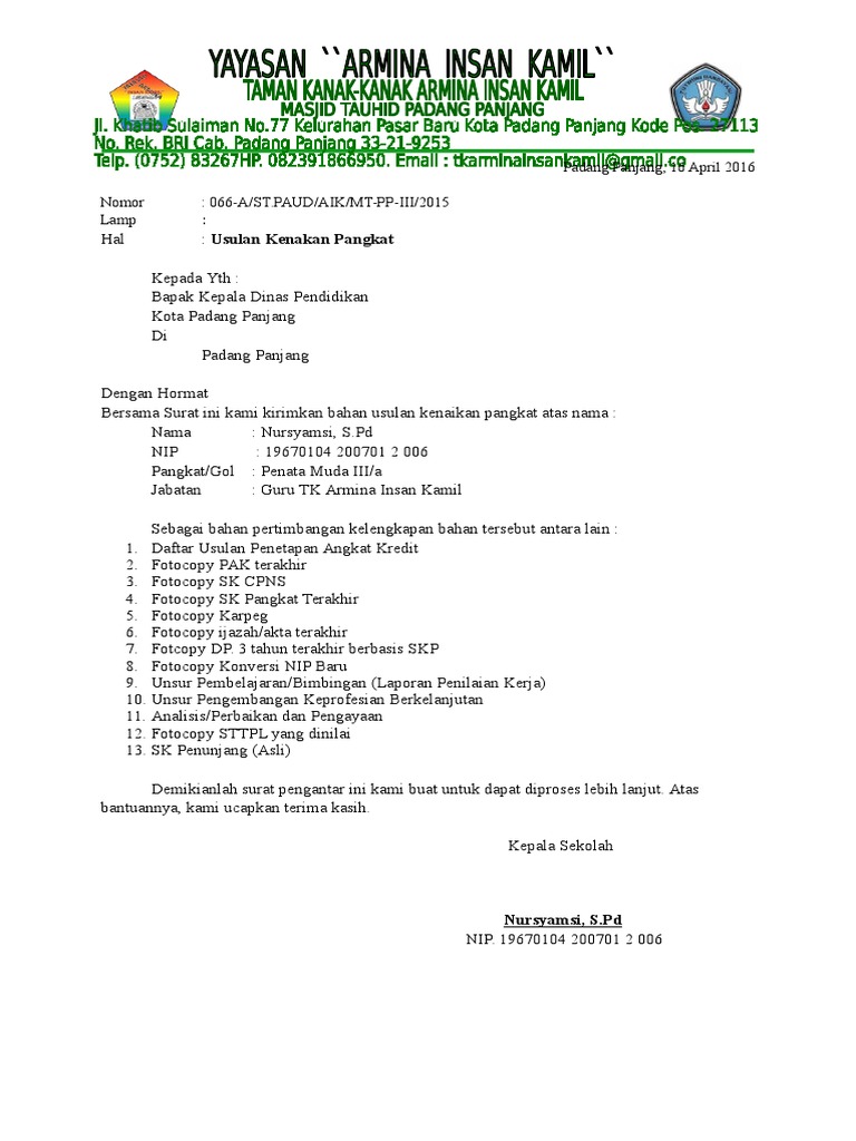 Kenaikan Pangkat Ppp Dg54 from imgv2-1-f.scribdassets.com Contoh surat usulan kenaikan pangkat. 12 contoh surat permohonan magang. Contoh surat perceraian secara kekeluargaan. Apakah kamu masih merasa kesulitan membuat surat dinas? Dosen b mengusulkan kenaikan jabatan ke lektor kepala tidak memiliki jurnal • contoh kasus : Pemerintah kabupaten bogor dinas pendidikan upt pendidikan anak usia dini, taman kan. Peraturan menteri pertahanan contoh surat perintah nomor : Surat pengusulan kenaikan pangkat pns , dibuat dalam rangka peningkatan kinerja guru maupun pegawai dengan syarat dan ketentuan yang berlaku.