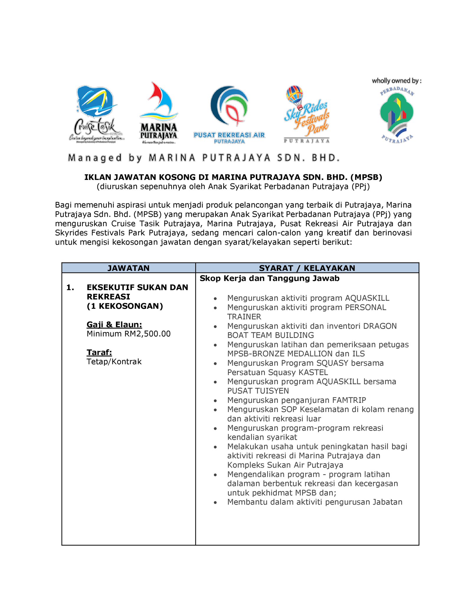 Kerja kosong perbadanan putrajaya | peluang kerjaya terkini untuk anda semua kepada mereka yang sedang mencari jawatan kosong jangan lepaskan iklan jawatan pekerja sambilan harian (psh) bagi gred 41, gred 29 dan gred 19 di unit kerjasama awam swasta, kementerian kewangan malaysia.