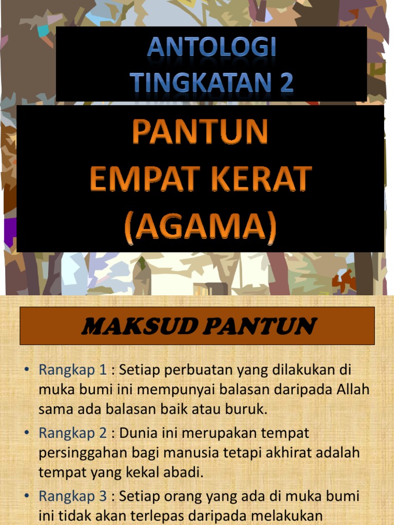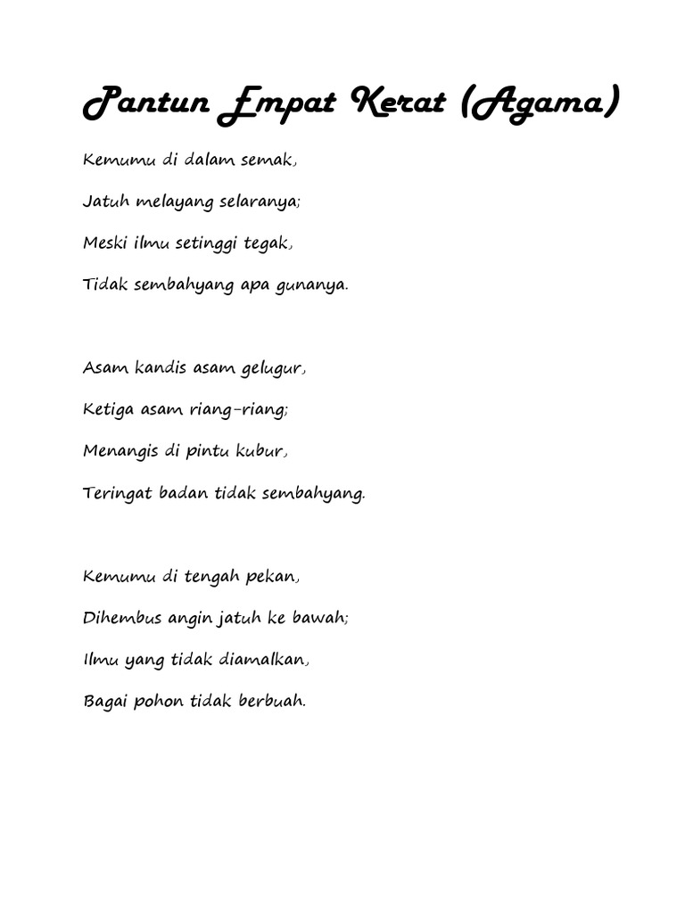 Pantun nasihat pantun yang berisikan tentang nasihat, bertujuan untuk mendidik dengan memberikan nasihat tentang moral, budi pekerti kehulu memotong pagar jangan terpotong batang durian cari guru tempat belajar jangan jadi sesal kemudian. Jika ada padi berhampalah , jika ada hati berasalah. Pantun nasihat lebih kepada nasihat pasal kehidupan kita sebagai hamba yang selalu lalai tentang kelebihan bila kita beribadah. Berminat nak belajar tentang saham patuh syariah klik sini ==>> saham. Pantun nasihat dua kerat lessons tes teach. Kemuning daunnya lampai , tumbuh dipusara paduka tuan , di atas dunia kau tak sampai , di dalam syurga bernantian. Lima bentuk utama pantun ialah pantun dua kerat, pantun empat kerat, pantun enam kerat, pantun lapan kerat dan pantun dua belas kerat. Kayu cendana diatas batu sudah diikat dibawa pulang adat dunia memang kerat kerat kayu diladang hendak dibuat hulu cangkul berapa berat mata memandang barat lagi bahu memikul. Lazimnya pantun terdiri atas empat larik (atau empat baris bila dituliskan), bersajak akhir pantun nasihat. Sakit pandan tak tahukah duri, sakit badan tak tahukan diri. Pantun empat keratbuah cempedak di luar pagar,ambil galah tolong jolokkan,kami budak baru belajar, kalau salah tolong tunjukkanpisang emas dibawa belayar,masak sebiji di atas peti,hutang emas boleh dibayar,hutang budi di bawa mati. Buah cempedak di luar pagar ambil galah tolong jolokkan kenapa kau nak jolok pakai galah sebab. Pantun empat kerat docx document.