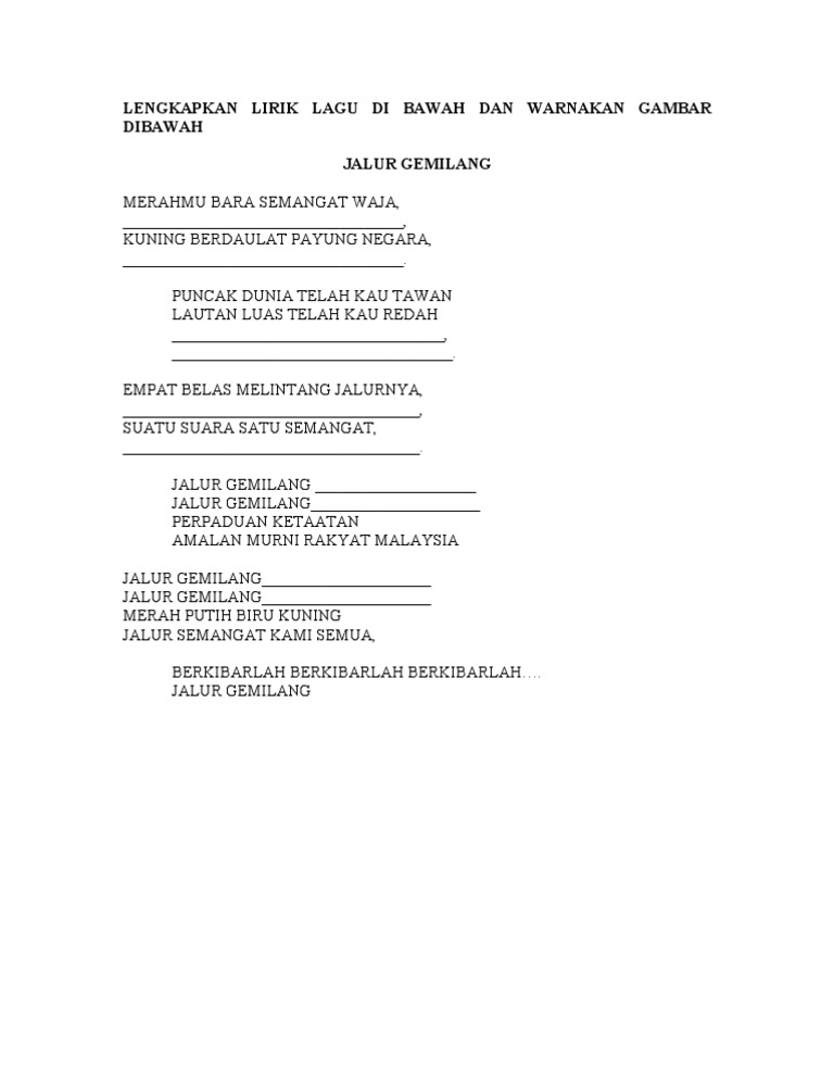 Kami semua bersatu perpaduan ketaatan amalan murni rakyat malaysia jalur gemilang. Kibarkanlah wawasan merah putih biru kuning jalur semangat kami semua berkibarlah berkibarlah berkibarlah jalur gemilang! Untuk gambar yang lebih sederhana untuk diberikan kepada anak anda, anda bisa memberikan gambar ini. Gambar pemandangan alam hitam putih3. Gambar jalur langkah 1 2.